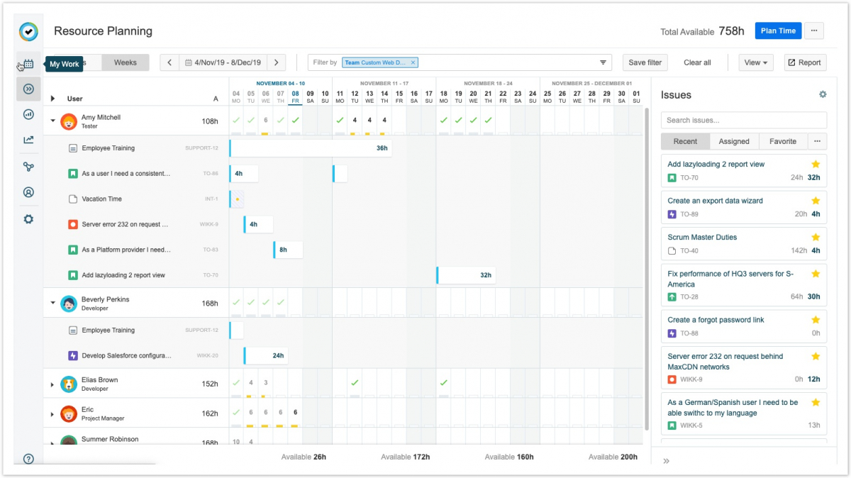 Просмотр «Планирование ресурсов» (Resource Planning) показывает доступность ваших ресурсов и позволяет сразу увидеть, у кого из членов команды есть свободные часы, а кто перебронирован. Вы можете выбрать между просмотром по дням для получения более подробной информации или просмотром по неделям для увеличения. Настройте вид и используйте фильтры при просмотре ресурсов и планируйте время своей команды на уровне задачи или проекта непосредственно на временной шкале или перетаскивая задачи из боковой панели «Задачи». Планирование ресурсов показывает членов команд, которые видны вам.