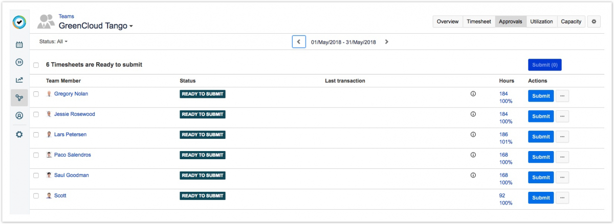 - Чтобы отправить расписания для нескольких членов команды, выберите членов команды, для которых вы хотите отправить расписания, и нажмите кнопку «Отправить» ("Submit") сверху.