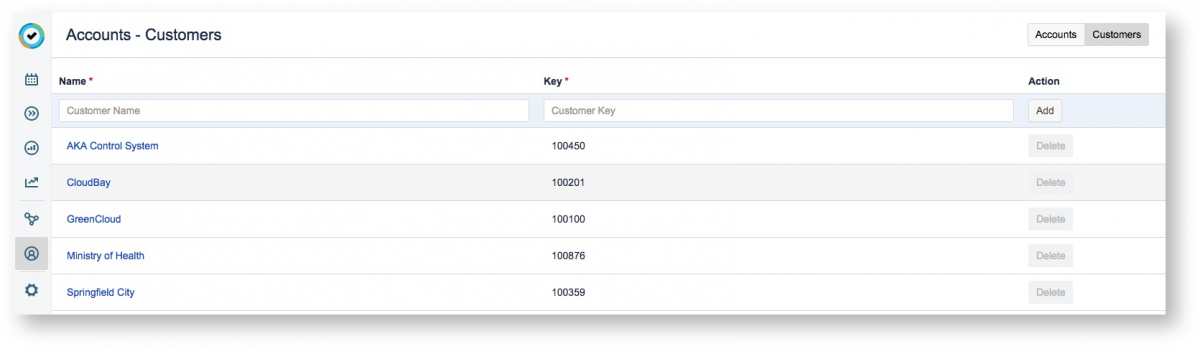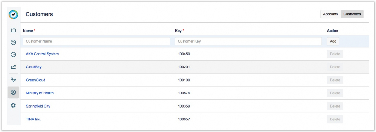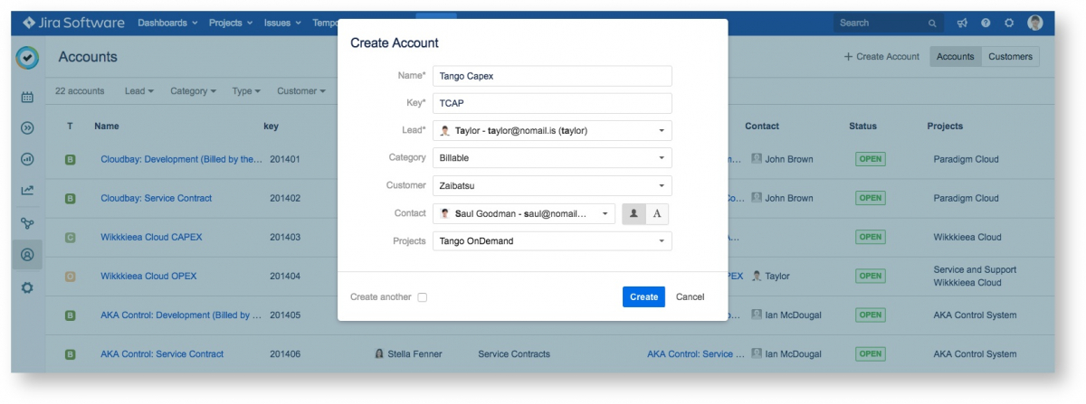 Вы можете создавать учетные записи для клиентов с целью выставления счетов. Затем вы можете подключить учетные записи к проектам Jira, над которыми вы будете работать для клиента. Клиенты и учетные записи создаются и управляются в просмотре «Учетные записи» ("Accounts view").
