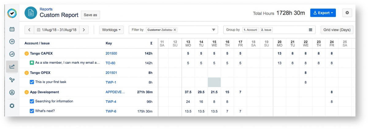 Вы можете настроить отчеты так, чтобы они содержали то, что вам нужно. По умолчанию результаты отчета отображаются в виде сетки, но вы также можете просмотреть данные в виде подробного списка. Вы можете применять фильтры, организовывать информацию в группы, сортировать данные по столбцам, устанавливать параметры отчета и добавлять столбцы для отображения полей Jira и рабочих атрибутов по мере необходимости. При просмотре отчетов в виде сетки вы также можете указать, будут ли сетки отображать дни, недели, месяцы или кварталы.