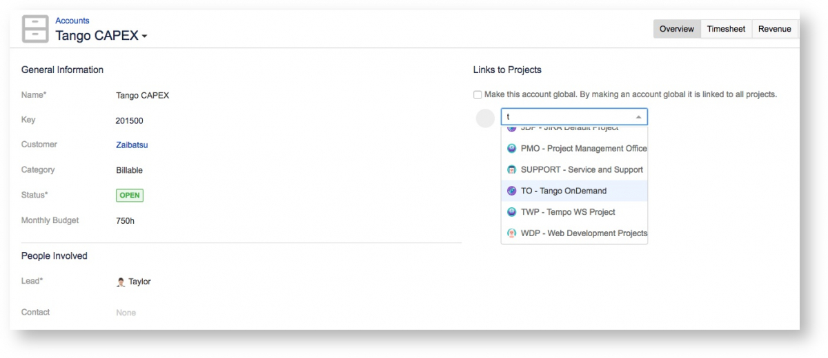 Учетные записи Tempo могут быть связаны с одним или несколькими проектами Jira. Связывая учетные записи с проектами и с «Пользовательское  поле учетной записи» ("Account Custom field"), соответствующим вашим потребностям, учетная запись становится опцией выбора либо в задачах Jira, либо в диалоговом окне «Регистрация времени» ("Log Time ").