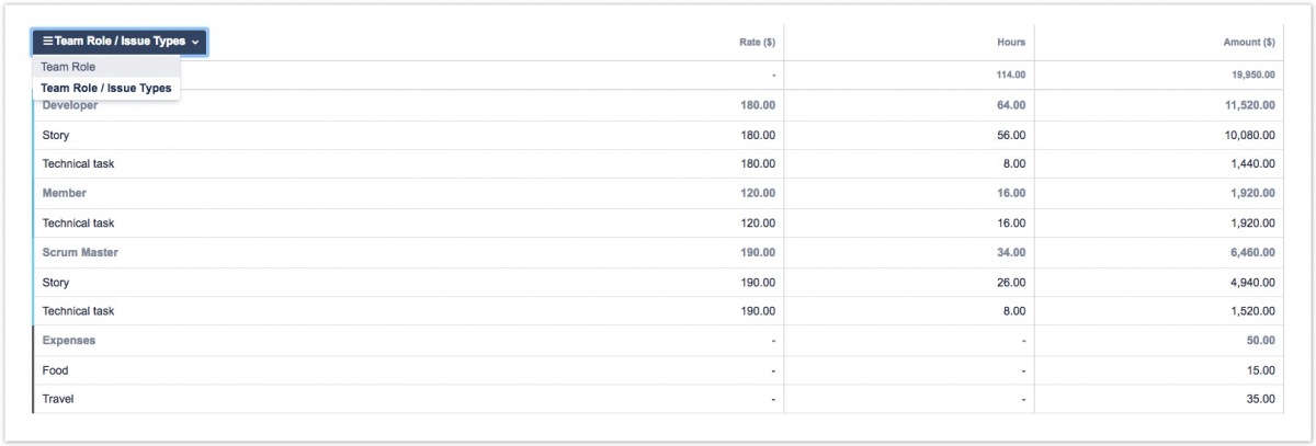 Таблица доходов учетных записей находится под графиком на странице доходов учетных записей и содержит список доходов по ролям команды, типам задач и категории растрат.