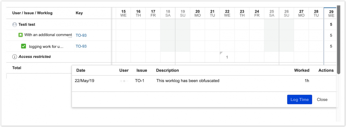 Если у вас есть разрешение «Просмотр часов задачи» ("View issue hours") для проекта, но нет необходимых разрешений для просмотра рабочих журналов других пользователей, вы можете увидеть общее количество часов на одну задачу в проекте, но не отдельные рабочие журналы от других пользователей.